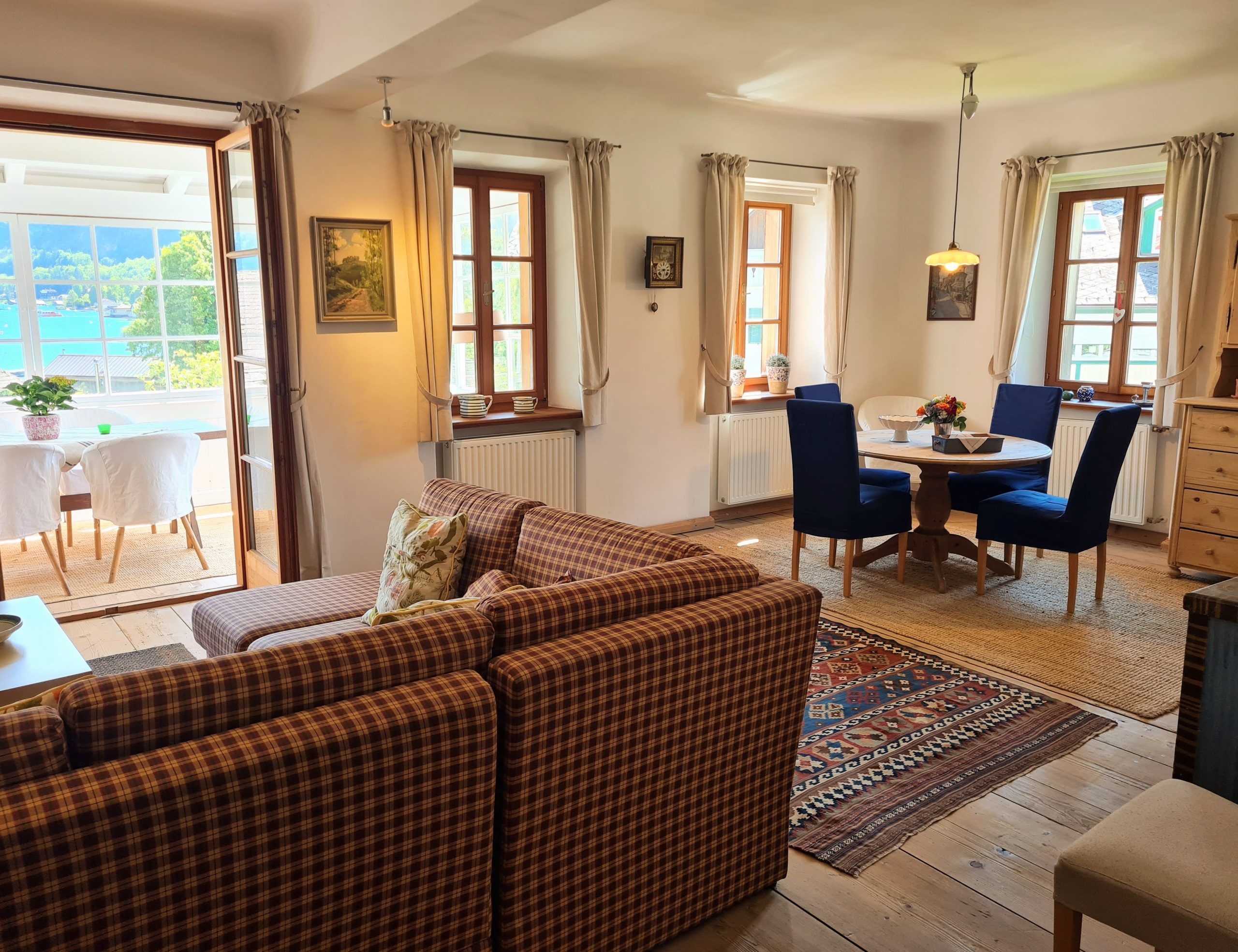 Sie liegt im ersten Obergeschoss und bereits beim Eintreten wird man gefangen genommen von einem herrlichen Blick auf den See und die umliegenden Berge.